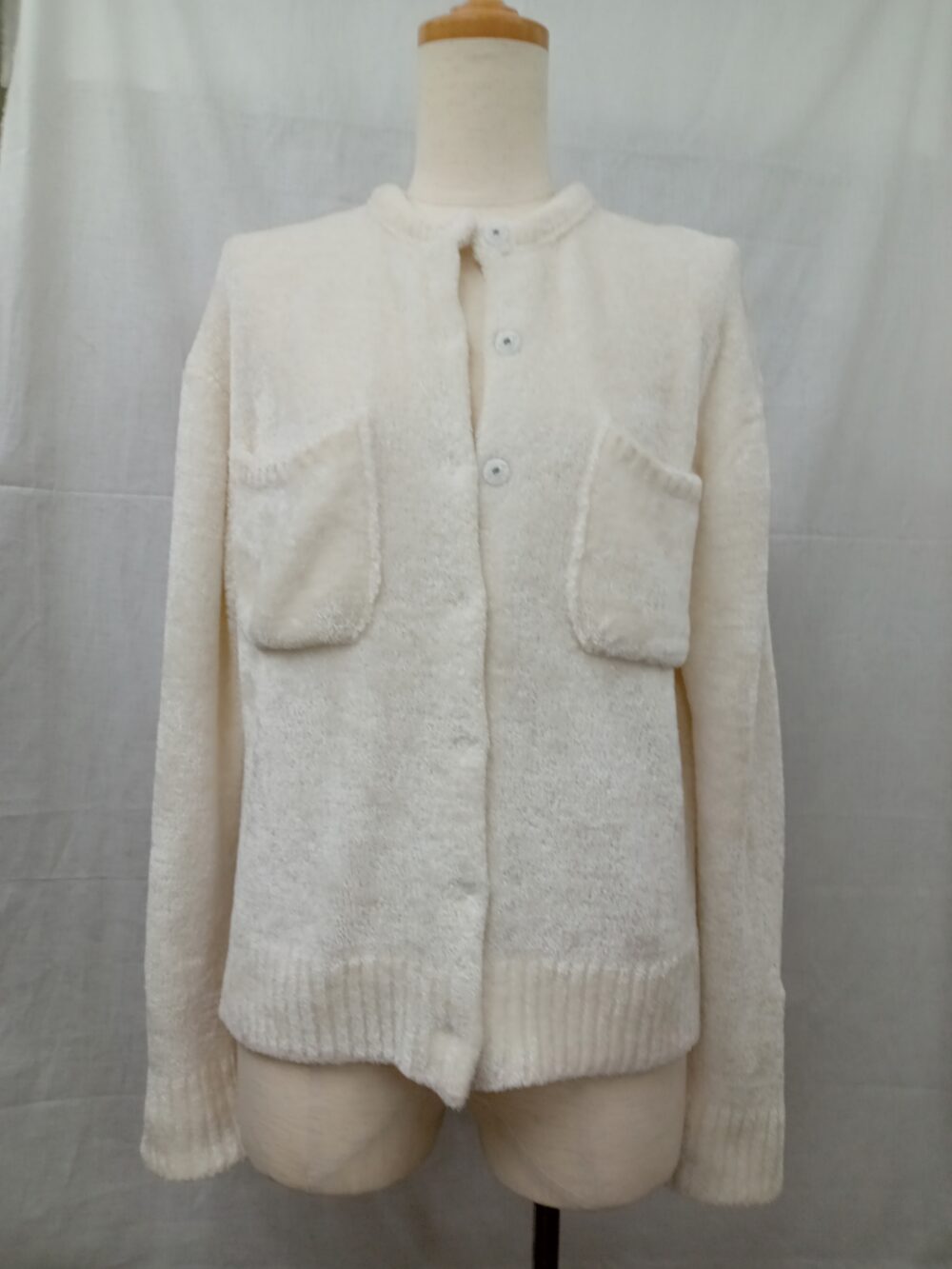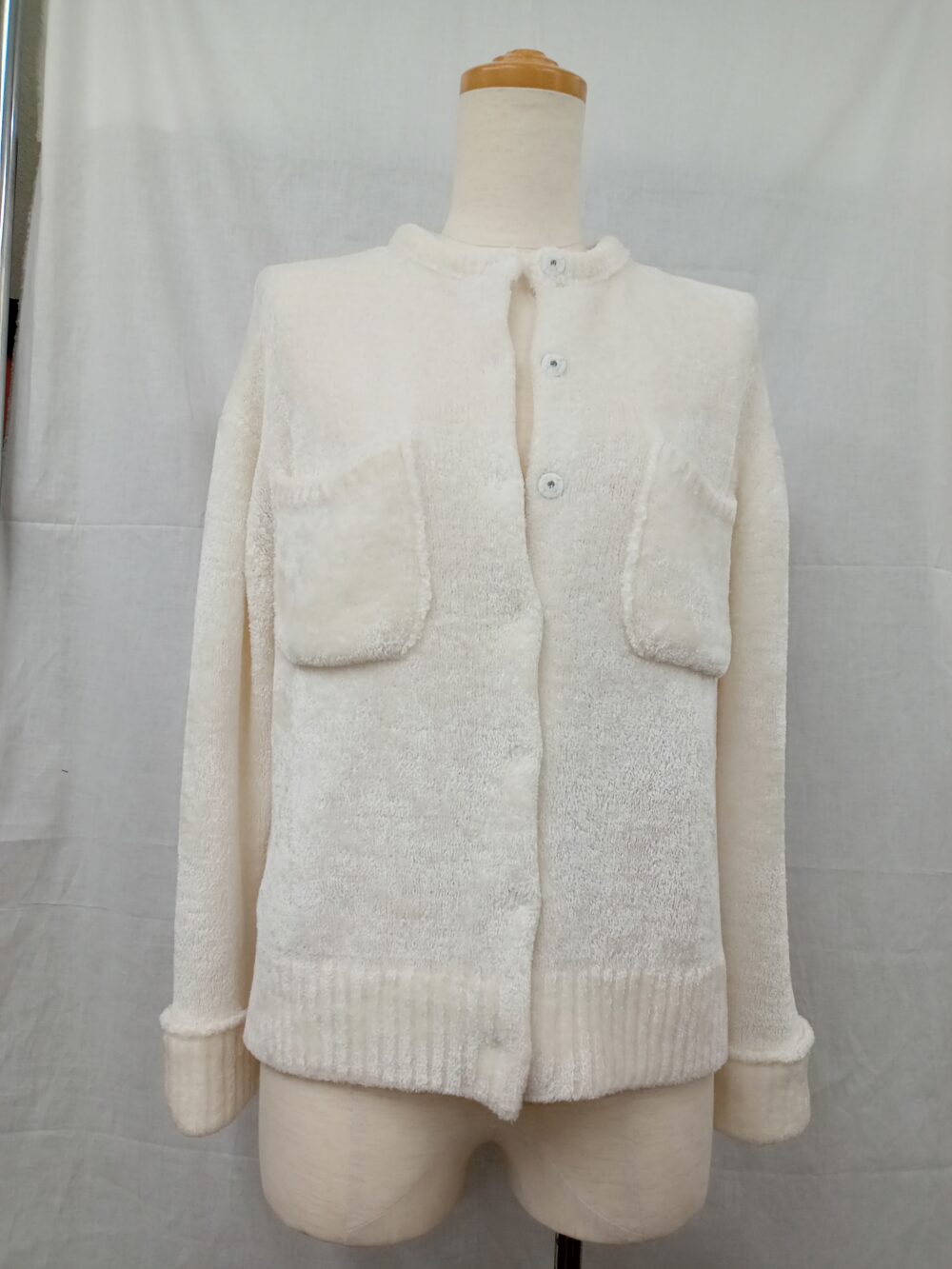 ニットカーディガンの袖丈詰めを袖口をカットせずに折り曲げステッチをいれて首元と近い感じに仕上げました。